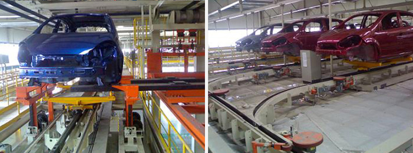 該系統(tǒng)采用空中、地面摩擦線(xiàn),主要用于:P11/P12、B13的白車(chē)身骨架輸送,簡(jiǎn)稱(chēng)為轉(zhuǎn)運(yùn)線(xiàn),P11/P12/B13/H13/S22/A18白車(chē)身整車(chē)焊裝到涂裝下件點(diǎn)的輸送和存儲(chǔ),簡(jiǎn)稱(chēng)存儲(chǔ)線(xiàn)。該摩擦線(xiàn)能滿(mǎn)足前六種車(chē)型的同時(shí)共線(xiàn)生產(chǎn)輸送用。