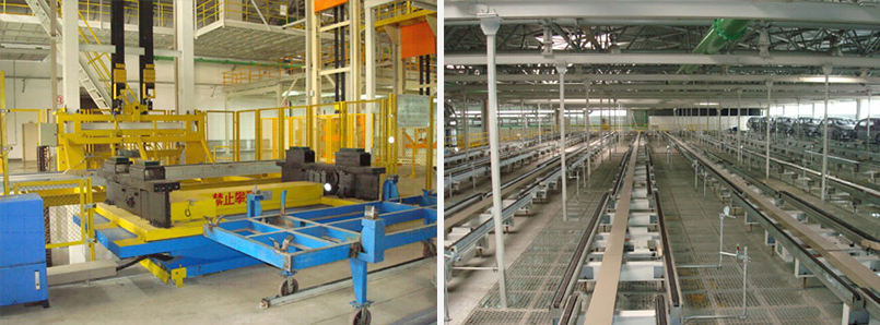 白車身從原來的升降段提升到系統(tǒng)上線處,接車后輸送到焊裝空中存儲線,在由存儲線輸送到涂裝車間,白車身在上線升降段提到到位,M1、M2車在地面通過從焊裝到涂裝的儲存線的升降段進入焊裝至涂裝儲存線的全部工位,包括鏈式滾床、升降段等。在車身經(jīng)升降段進入空中儲存線的結(jié)構(gòu)平臺后,設(shè)置打號機操作區(qū),滾床儲存線和打號機具有通信和連鎖功能。該設(shè)備的生產(chǎn)節(jié)拍為110s/臺,A1車焊裝空中儲存區(qū)設(shè)計的白車身儲存量為100臺。白車身從焊裝車間進入涂裝車間的方式為過廊,在過廊設(shè)置三條滾床輸送線,過廊兩端設(shè)置帶式升降機。A1車身焊裝儲存線設(shè)車身自動分類編組功能,焊裝至涂裝的三條輸送線,分別對應(yīng)A1、M1、M2車身的自動分組輸送功能。A1車身焊裝儲存線和焊裝至涂裝儲存線中包含橫移機和旋轉(zhuǎn)臺,并在附近設(shè)一操作臺,便于手動和自動的切換。電氣控制系統(tǒng)采用PLC、總線控制方式,控制系統(tǒng)配置人機界面的觸摸屏,實現(xiàn)人機交流。