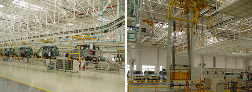 該系統(tǒng)主要由以下三部分組成:漆后車(chē)身輸送線、內(nèi)裝飾線、底盤(pán)線。漆后車(chē)身輸送線主要用于將涂裝好的車(chē)身儲(chǔ)存及轉(zhuǎn)運(yùn),線體采用滑撬輸送機(jī),涂裝車(chē)間的旋轉(zhuǎn)滾床將編組后的漆后車(chē)身送入過(guò)廊上的雙鏈輸送機(jī)。車(chē)身在過(guò)廊上儲(chǔ)存和輸送,在轉(zhuǎn)掛滾床上定位,經(jīng)液壓舉升叉式移栽機(jī)將車(chē)身轉(zhuǎn)移到旋轉(zhuǎn)滾床上,在通過(guò)叉式移栽升降機(jī)將車(chē)身落到內(nèi)裝飾線的隨動(dòng)裝置上。內(nèi)裝飾線采用版式輸送機(jī),從漆后車(chē)身輸送線通過(guò)隨動(dòng)裝置接漆后車(chē)身,再將內(nèi)飾后的車(chē)身送到底盤(pán)線。底盤(pán)線包括:底盤(pán)裝配線、車(chē)門(mén)分裝線、車(chē)輪分裝線、儀表臺(tái)分裝線、前懸分裝線、后懸分裝線、發(fā)動(dòng)機(jī)分裝線、座椅分裝線、最終裝配線等。控制系統(tǒng)采用五套分控制系統(tǒng),系統(tǒng)一控制漆后車(chē)身輸送線及內(nèi)實(shí)現(xiàn)轉(zhuǎn)接升降設(shè)備;系統(tǒng)二控制內(nèi)飾車(chē)門(mén)線及儀表分裝線;系統(tǒng)三控制底盤(pán)、輪胎、座椅線、發(fā)動(dòng)機(jī)和前后懸分裝線;系統(tǒng)四控制最終裝配線、車(chē)身轉(zhuǎn)運(yùn)及OK線;系統(tǒng)五控制外觀檢測(cè)線。